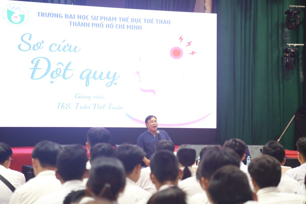 Tiếp nối chương trình, chuyên đề “Cách sơ cứu chấn thương trong học tập và tập luyện thể dục thể thao” do Thạc sĩ, Bác sĩ Trần Viết Tuấn, Giảng viên Trung tâm Sơ cấp cứu và Phòng chống thảm họa Thành phố Hồ Chí Minh trình bày đã cung cấp cho sinh viên những kiến thức và kỹ năng cần thiết nhằm xử lý kịp thời các tình huống chấn thương thường gặp. Nội dung chuyên đề tập trung vào nhận biết chấn thương, nguyên tắc sơ cứu đúng cách, các kỹ thuật cơ bản như băng ép, cố định tạm thời, cũng như phương pháp xử trí các tình huống khẩn cấp trong hoạt động thể dục thể thao. Qua đó, sinh viên được nâng cao ý thức phòng ngừa rủi ro, chủ động bảo vệ sức khỏe bản thân và hỗ trợ người xung quanh, góp phần xây dựng môi trường học đường an toàn, lành mạnh.