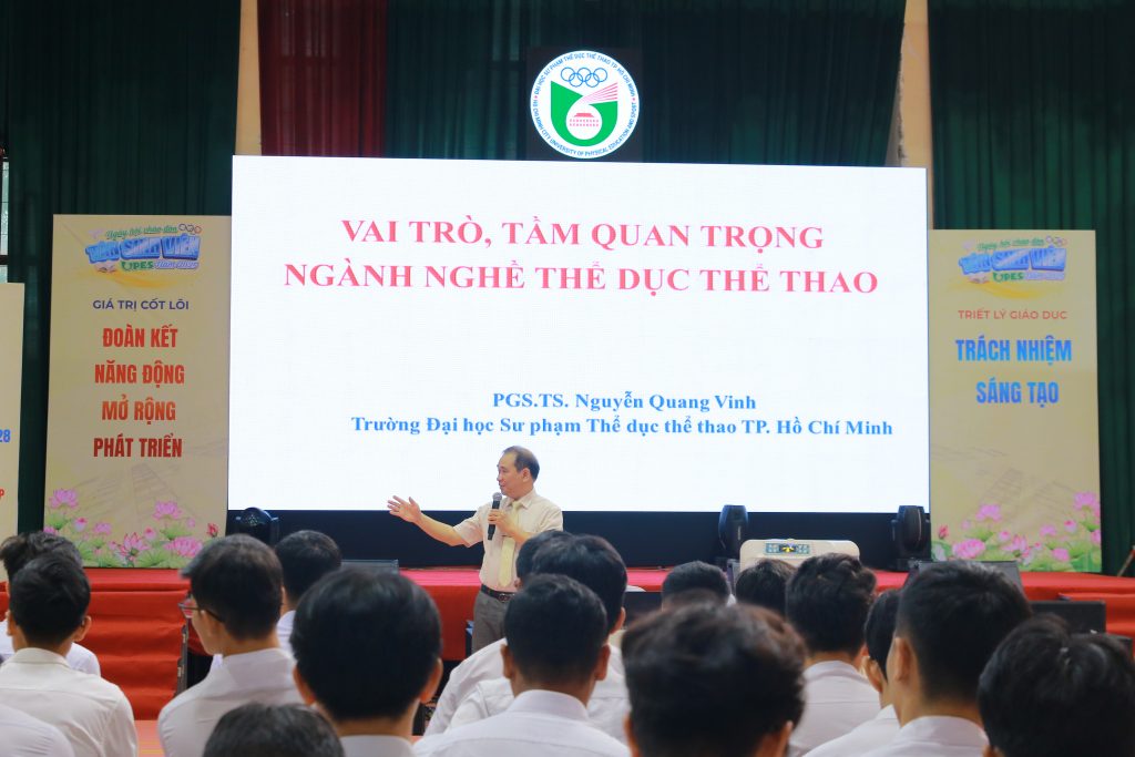 Với chuyên đề “Các ngành học về thể thao: tiềm năng phát triển và định hướng tương lai”, PGS.TS. NGƯT Nguyễn Quang Vinh – Phó Hiệu trưởng Nhà trường đã mang đến cho sinh viên cái nhìn tổng quan, sâu sắc về vai trò ngày càng quan trọng của thể thao trong đời sống hiện đại, gắn với sức khỏe cộng đồng, giáo dục và thị trường lao động. Báo cáo viên giới thiệu các ngành học chủ lực như Giáo dục thể chất, Huấn luyện thể thao, Quản lý thể dục thể thao, đồng thời gợi mở những xu hướng phát triển mới như công nghệ, truyền thông và tổ chức sự kiện thể thao. Không chỉ dừng lại ở việc lựa chọn ngành học, chuyên đề còn nhấn mạnh yêu cầu sinh viên cần không ngừng rèn luyện kỹ năng mềm, năng lực giao tiếp, làm việc nhóm, tư duy phản biện và thái độ học tập nghiêm túc, coi đây là hành trang quan trọng để phát triển bền vững trong môi trường lao động hiện đại.