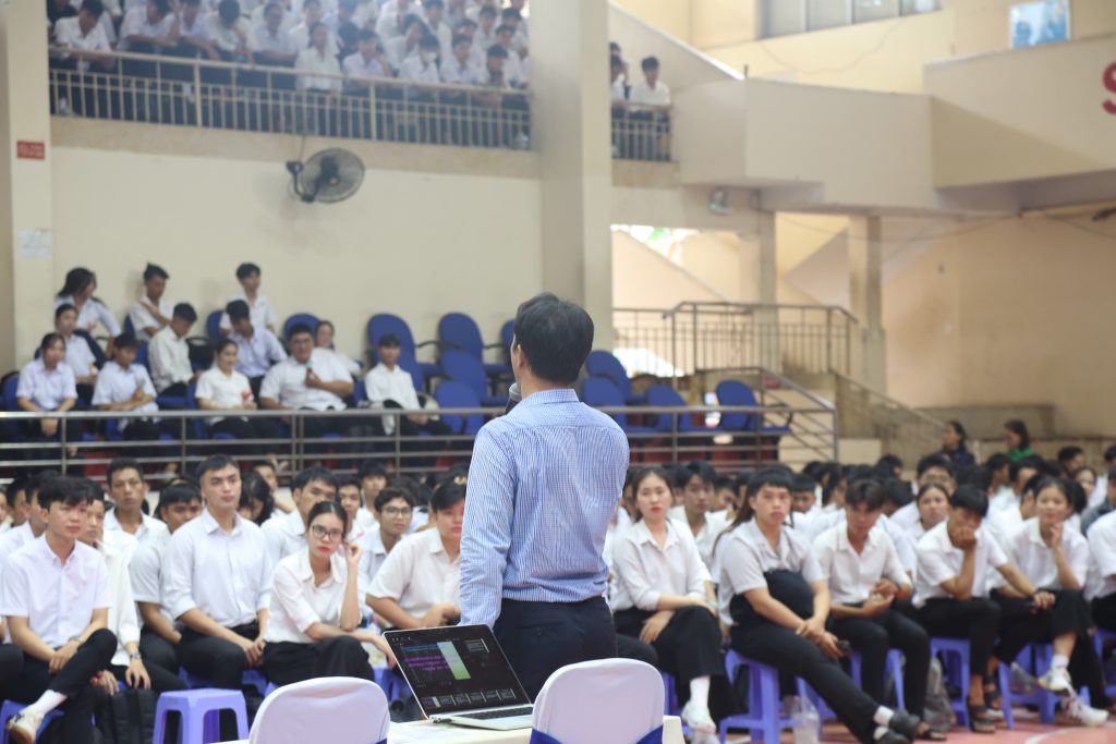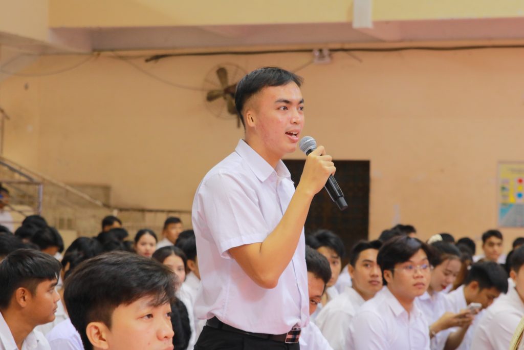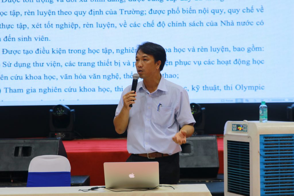 Bên cạnh định hướng về chuyên môn và nghề nghiệp, chương trình sinh hoạt công dân đầu năm cũng dành thời lượng phù hợp để trang bị cho sinh viên những hiểu biết cần thiết về quy chế, chế độ và trách nhiệm trong quá trình học tập, rèn luyện. ThS. Nguyễn Đắc Thịnh – Trưởng phòng Công tác Sinh viên và Phục vụ cộng đồng đã trực tiếp phổ biến các quy định quan trọng liên quan đến quyền và nghĩa vụ của sinh viên, quy định xét điểm rèn luyện, học bổng, cảnh báo học tập, nghỉ học tạm thời, buộc thôi học, cũng như những hành vi sinh viên không được thực hiện trong môi trường giáo dục.